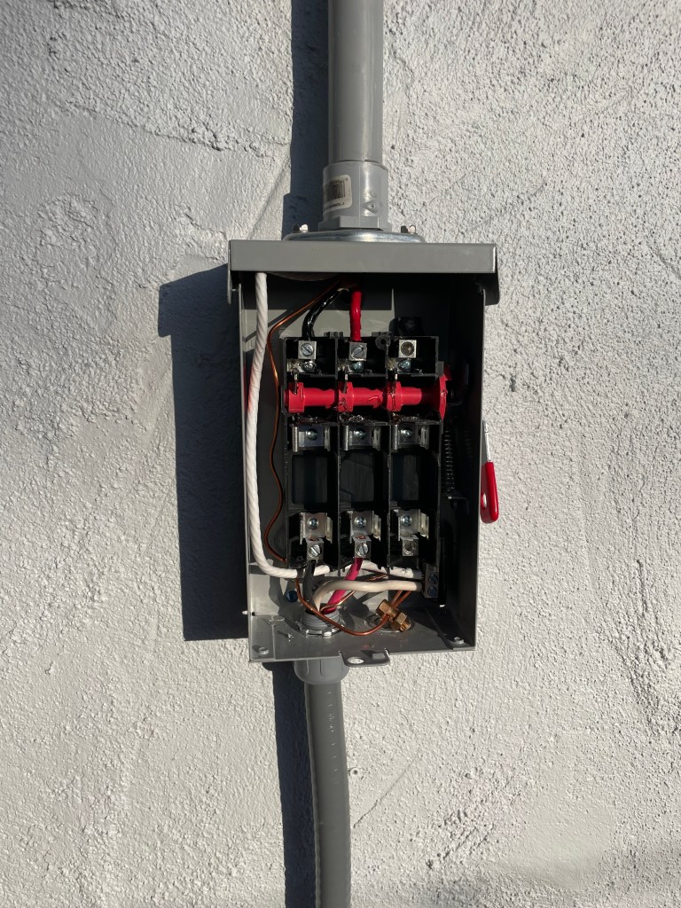Installation of additional circuit with an emergency shutdown (stop, disconnect) button, including cable drop, conduit, and connection to the hot tub.
